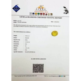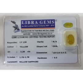 REPORT NO . LY 120CLARITY . N/ACOLOUR . YELLOWSHAPE / CUT . OVALWT . 3.28 CTSDIMENSION . 10-5.6-3.5-2.R . INDEX . 1.76-1.78HARDNESS . 9.0COMMENT . YELLOW SAPPHIRE..