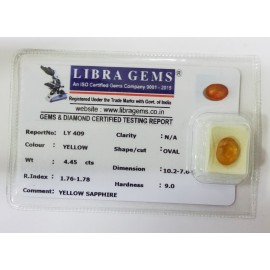 REPORT.NO.LY 409CLARITY.N/ACOLOUR.YELLOWSHAPE/CUT.OVALWT.4.45 CTSDIMENSION.10.2-7.6-5.2R.INDEX.1.76-1.78HARDNESS.9.0COMMENT.YELLOW SAPPHIRE..