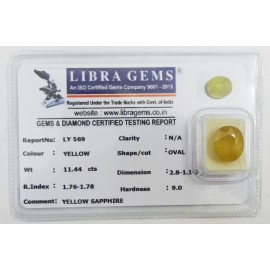 REPORT.NO.LY 569CLARITY.N/ACOLOUR.YELLOWSHAPE/CUT.OVAL WT.11.44 CTSDIMENSION.2.8-1.1-7.8R.INDEX.1.76-1.7.8HARDNESS.9.0COMMENT.YELLOW SAPPHIRE..