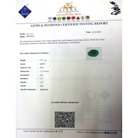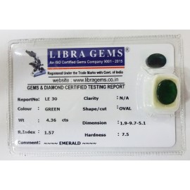 REPORT NO . LE 30CLARITY . N/ACOLOUR . GREENSHAPE / CUT . OVALWT . 4.36 CTSDIMENSION . 1-9.9-7.5-1.R . INDEX . 1.57HARDNESS . 7.5COMMENT . EMERALD..
