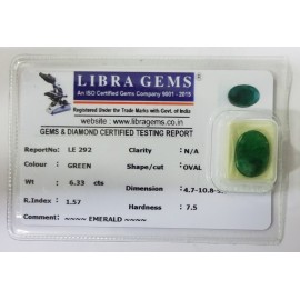 REPORT.NO.-LE 292CLARITY.-N/ACOLOUR.-GREENSHAPE/CUT.-OVALWT.-6.33 CTSDIMENSION.-4.7-10.8-5.7R.INDEX.-1.57HARDNESS.-7.5COMMENT.-EMERALD..