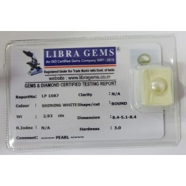 REPORT NO . LP 1087CLARITY . N/ACOLOUR . SHINING WHITESHAPE / CUT . ROUNDWT . 2.93 CTSDIMENSION . 8-4.5-1.8-4.R . INDEX . N/AHARDNESS . 3.0COMMENT . PEARL..