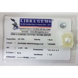 REPORT NO . LP 195CLARITY . N/ACOLOUR . SHINING WHITESHAPE / CUT . ROUNDWT . 3.05 CTSDIMENSION . 8-1.8-1.3-7.R . INDEX . N/AHARDNESS . 3.0COMMENT . PEARL..