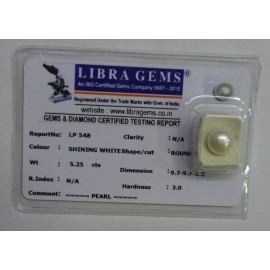 REPORT NO . LP 548CLARITY . N/ACOLOUR .SHINING WHITEWT . 5.25 CTSDIMENSION . 9-7.9-7.6-8.R . INDEX . N/AHARDNESS . 3.0COMMENT . PEARL..