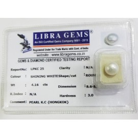 REPORT.NO.-LPKC 25CLARITY.-N/ACOLOUR.-SHINING WHITESHAPE/CUT.-ROUNDWT.-4.16 CTSDIMENSION.-8-6.8-5.7-7.R.INDEX.-N/AHARDNESS.-3.0COMMENT.-PEARL K.C { HONGKOK }..