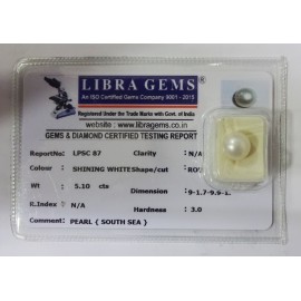 REPORT NO . LPSC 87CLARITY . N/ACOLOUR . SHINING WHITESHAPE / CUT . ROUNDWT . 5.10 CTSDIMENSION . 9-1.7-9.9-1.R . INDEX . N/AHARDNESS . 3.0COMMENT . PEARL { SOUTH SEA }..
