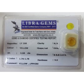 REPORT NO . LY 208CLARITY . N/ACOLOUR . YELLOWSHAPE / CUT . OVALWT . 3.18 CTSDIMENSION . 8-8.8-2.4-5.R . INDEX . 1.76-1.78HARDNESS . 9.0COMMENT . YELLOW SAPPHIRE ..