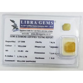 REPORT.NO.LY 598CLARITY.N/ACOLOUR.YELLOWSHAPE/CUT.SQUAREWT.12.81 CTSDIMENSION.1.6-1.2-8.2R.INDEX.1.76-1.7.8HARDNESS.9.0COMMENT.YELLOW SAPPHIRE..