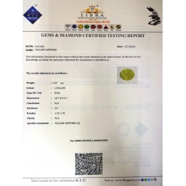 REPORT.NO.LYS 171CLARITY.N/ACOLOUR.L.YELLOW SHAPE/CUT.OVALWT.3.42 CTSDIMENSION.9.7-7.2-5.4R.INDEX.1.76-1.78HARDNESS.9.0COMMENT.YELLOW SAPPHIRE {S}..