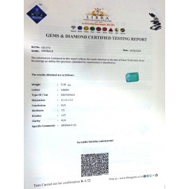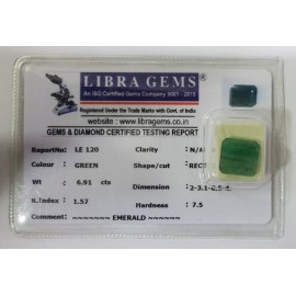 REPORT NO . LE 120CLARITY . N/ACOLOUR . GREENSHAPE / CUT . RECTANGLEWT .6.91 CTSDIMENSION . 2-3.1-6.5-4.R . INDEX . 1.57HARDNESS . 7.5COMMENT . EMERALD..