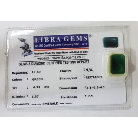 REPORT NO . LE 49CLARITY . N/ACOLOUR . GREENSHAPE / CUT . RECTANGLEWT . 4.33 CTSDIMENSION . 3-1.9-3.4-1.R  . INDEX . 1.57HARDNESS . 7.5COMMENT . EMERALD..