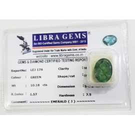 REPORT.NO.-LEJ 176CLARITY.-N/ACOLOUR.-GREENSHAPE/CUT.-OVALWT.-10.18 CTSDIMENSION.-5-6.1-4.7-7.R.INDEX.-1.57HARDNESS.-7.5COMMENT.-EMERALD { J }..