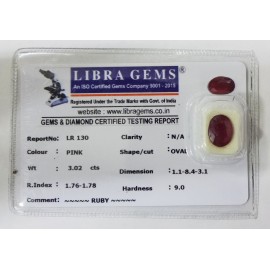 REPORT NO . LR 130CLARITY . N/ACOLOUR . PINKSHAPE / CUT . OVALWT . 3.02 CTSDIMENSION . 1-1.8-4.3-1.R . INDEX . 1.76-1.78HARDNESS . 9.0COMMENT . RUBY..