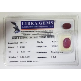 REPORT.NO.-LR 311CLARITY.-N/ACOLOUR.-PINKSHAPE/CUT.-OVALWT.-8.50 CTSDIMENSION.-2.4-9.1-7.1R.INDEX.-1.76-1.78HARDNESS.-9.0COMMENT.-RUBY..