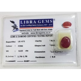 REPORT.NO.-LR 472CLARITY.-N/ACOLOUR.-PINKSHAPE/CUT.-OVALWT.-8.03 CTSDIMENSION.-2-1.9-9.6-7.R.INDEX.-1.76-1.78HARDNESS.-9.0COMMENT.-RUBY..