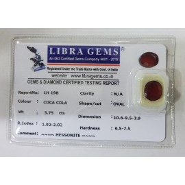 REPORT NO . LH 198CLARITY . N/ACOLOUR . COCA COLASHAPE / CUT . OVALWT . 3.75 CTSDIMENSION . 10+-6.9-5.3-9.R . INDEX . 1.92-2.02HARDNESS . 6.5-7.5COMMENT . HESSONITE..