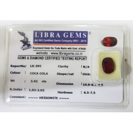 REPORT.NO.-LH 295CLARITY.-N/ACOLOUR.-COCA COLASHAPE/CUT.- OVALWT.-3.42 CTSDIMENSION.-10-9.8-1.4-6.R.INDEX.-1.92-2.02HARDNESS.-6.5-7.5COMMENT.- HESSONITE..