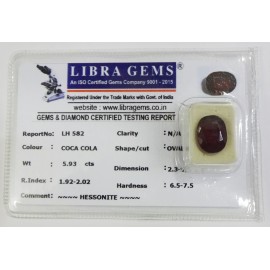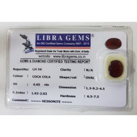 REPORT NO . LH 56CLARITY . N/ACOLOUR . COCA COLASHAPE / CUT . OVALWT . 4.65 CTSDIMENSION . 1-3.9-2.4-5.R . INDEX . 1.92-2.02HARDNESS . 6.5-7.5COMMENT . HESSONITE ..
