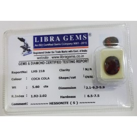 DATE: 15-4-2025REF.NO: LHS 457NAME: HESSONITEWEIGHT: 4.78 CTSCOLOUR: COCA COLATYPE OF/CUT: OVALDIMENSION: 1.1-9.5-5.7/CONCLUSION: N/AHARDNESS: 6.5-7.5R.INDEX: 1.92-2.02CLARITY: N/ASPECIFIC COMMENTS: H..