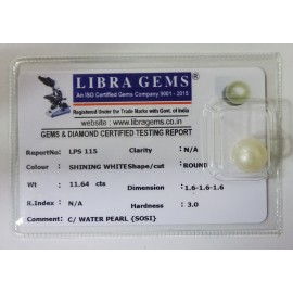REPORT NO . LPS 115CLARITY . N/ACOLOUR . SHINING WHITESHAPE / CUT . ROUNDWT . 11.64 CTSDIMENSION . 1-6.1-6.1-6.R . INDEX . N/AHARDNESS . 3.0COMMENT . C / WATER PEARL { SOSI }..