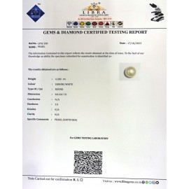 REPORT.NO.LPSC 123CLARITY.N/ACOLOUR.SHINING WHITESHAPE/CUT.ROUND WT.6.48 CTSDIMENSION.9.8-9.8-9.6R.INDEX.N/AHARDNESS.3.0COMMENT.PEARL {SOUTH SEA}..