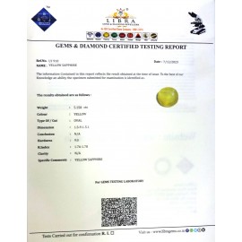 REPORT NO . LY 36CLARITY . N/ACOLOUR . YELLOWSHAPE / CUT . OVALWT . 4.63 CTSDIMENSION . 10-2.8-1.5-9.R . INDEX . 1.76-1.78HARDNESS . 9.0COMMENT . YELLOW SAPPHIRE..