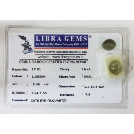 REPORT NO . LC 91CLARITY . N/ACOLOUR . L . GREENSHAPE / CUT . ROUNDWT . 5.49 CTSDIMENSION . 1-1.10-5.6-9.R . INDEX . 1.54-1.55HARDNESS . 7.5COMMENT . CATS EYE { S . SQUARTZ }..