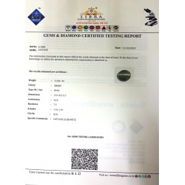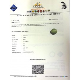 DATE:13-10-2023REF.NO:LC 1038NAME:CATS EYE WEIGHT:5.25 CTSCOLOUR:GREENTYPE OF/CUT:OVALDIMENSION:10.9-9.4-7.1CONCLUSION:N/AHARDNESS:7.5R.INDEX:1.54-1.55CLARITY:N/ASPECIFIC COMMENTS:CATS ..
