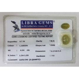 REPORT NO . LC 34CLARITY . N/ACOLOUR . L . GREENSHAPE / CUT . OVALWT . 4.54 CTSDIMENSION . 2-2.9-8.5-5.R . INDEX . 1.54-1.55HARDNESS . 7.5COMMENT . CATS EYE { S . QUARTZ }..