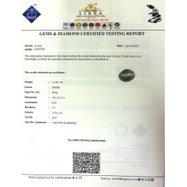 REPORT.NO.-LC 545CLARITY.-N/ACOLOUR.-GREENSHAPE/CUT.-OVALWT.-7.04 CTSDIMENSION.-3-1.1-2.6-6.R.INDEX.-1.54-1.55HARDNESS.-7.5COMMENT.-CATS EYE { S. QUARTZ }..