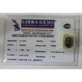 REPORT NO . LC 241CLARITY . N/ACOLOUR . GREENSHAPE / CUT . OVALWT . 7.60 CTSDIMENSION . 3-5.10-4.7-6.R . INDEX . 1.54-1.55HARDNESS . 7.5COMMENT . CATS EYE { S . QUARTZ }..