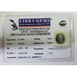 REPORT.NO.-LC 391CLARITY.-N/ACOLOUR.-GREENSHAPE/CUT.-OVALWT.-8.93 CTSDIMENSION.-3-6.1-1.8-2.R.INDEX.-1.54-1.55HARDNESS.-7.5COMMENT.-CATS EYE { S . QUARTZ }..