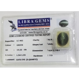 REPORT.NO.-LC 462CLARITY.-N/ACOLOUR.-GREENSHAPE/CUT.-OVALWT.-10.22 CTSDIMENSION.-4-8.2-2.8-1.R.INDEX.-1.54-1.55HARDNESS.-7.5COMMENT.-CATS EYE { S . QUARTZ }..