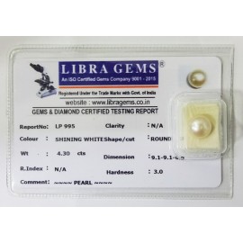 REPORT NO . LP 1116CLARITY . N/ACOLOUR . SHINING WHITESHAPE / CUT . ROUNDWT . 4.09 CTSDIMENSION . 8-9.6-6.8-9.R . INDEX . N/AHARDNESS . 3.0COMMENT . PEARL..