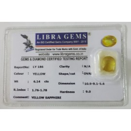 REPORT NO . LY 186CLARITY . N/ACOLOUR . YELLOWSHAPE / CUT . OVALWT . 6.14 CTSDIMENSION . 10-9.9-1.5-6.R . INDEX . 1.76-1.78HARDNESS . 9.0COMMENT . YELLOW SAPPHIRE..