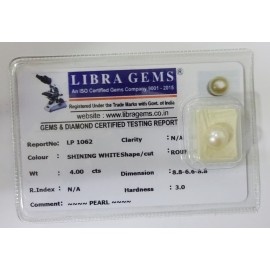 REPORT NO . LP 1062CLARITY . N/ACOLOUR . SHINING WHITESHAPE / CUT . ROUNDWT . 4.00 CTSDIMENSION . 8-8.6-6.8-8.R . INDEX . N/AHARDNESS . 3.0COMMENT . PEARL..