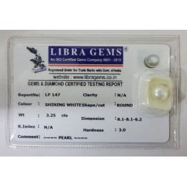 REPORT NO . LP 147CLARITY . N/ACOLOUR . SHINING WHITESHAPE / CUT . ROUNDWT . 3.25 CTSDIMENSION . 8-1.8-1.6-2.R . INDEX . N/AHARDNESS . 3.0COMMENT . PEARL..