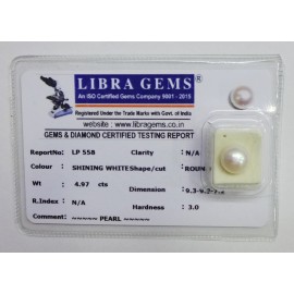 REPORT NO . LP 558CLARITY . N/ACOLOUR . SHINING WHITESHAPE / CUT . ROUNDWT . 4.97 CTSDIMENSION . 9-3.9-3.7-2.R . INDEX . N/AHARDNESS . 3.0COMMENT . PEARL..