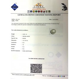 REPORT NO . LP 139CLARITY . N/ACOLOUR . SHINING WHITESHAPE / CUT . ROUNDWT . 3.52 CTSDIMENSION . 8-7.8-6.5-8.R . INDEX . N/AHARDNESS . 3.0COMMENT . PEARL..