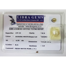 REPORT NO . LPV25CLARITY . N/ACOLOUR . SHINING WHITESHAPE / CUT . ROUNDWT .4.70 CTSDIMENSION . 9-6.8-3.8-4.R . INDEX . N/AHARDNESS . 3.0COMMENT . FRESH WATER PEARL { V }..