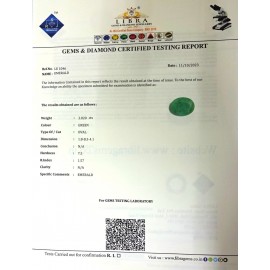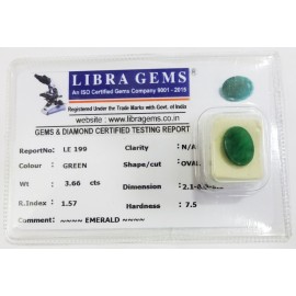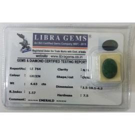 REPORT NO . LE 162CLARITY . N/ACOLOUR . GREENSHAPE / CUT . OVALWT . 7.44 CTSDIMENSION . 5-6.2-3.5-1.R . INDEX . 1.57HARDNESS . 7.5COMMENT . EMERALD..