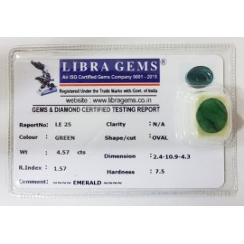 DATE:2025REF.NO:LEJ 379NAME:EMERALDWEIGHT:4.79 CTSCOLOUR:GREENTYPE OF/CUT:OVALDIMENSION:1-8.9-4.7-4.CONCLUSION:N/AHARDNESS:7.5R.INDEX:1.57CLARITY:N/ASPECIFIC COMMENTS:EMERALD {Z}..