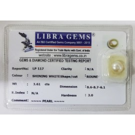 REPORT NO . LP 117CLARITY . N/ACOLOUR . SHINING WHITESHAPE / CUT . ROUNDWT . 3.61 CTSDIMENSION . 8-6.8-7.6-1.R . INDEX . N/AHARDNESS . 3.0COMMENT . PEARL..