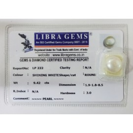 REPORT NO . LP 222CLARITY . N/ACOLOUR . SHINING WHITESHAPE / CUT . ROUNDWT . 9.42 CTSDIMENSION . 1-9.1-8.8-5.R . INDEX . N/AHARDNESS . 3.0COMMENT . PEARL..