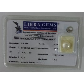 REPORT NO . LP 594CLARITY . N/ACOLOUR . SHINING WHITESHAPE / CUT . ROUNDWT . 4.82 CTSDIMENSION . 9-2.9-2.6-5.R . INDEX . N/AHARDNESS . 3.0COMMENT . PEARL..