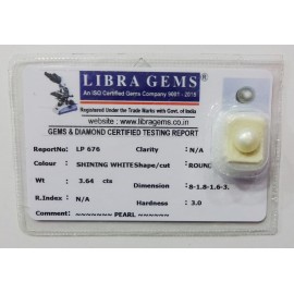 REPORT NO . LP 676CLARITY . N/ACOLOUR . SHINING WHITESHAPE / CUT . ROUNDWT . 3.64 CTSDIMENSION . 8-1.8-1.6-3.R . INDEX . N/AHARDNESS . 3.0COMMENT . PEARL..
