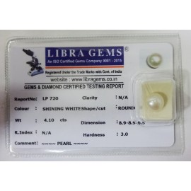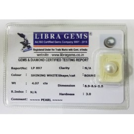 REPORT NO . LP 897CLARITY . N/ACOLOUR . SHINING WHITESHAPE / CUT . ROUNDWT . 4.07 CTSDIMENSION . 8-9.8-9.6-8.R . INDEX . N/AHARDNESS . 3.0COMMENT . PEARL..