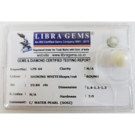 REPORT NO . LPS 44CLARITY . N/ACOLOUR . SHINING WHITESHAPE / CUT . ROUNDWT . 10.84 CTSDIMENSION . 1-4.1-3.1-3.R . INDEX . N/AHARDNESS . 3.0COMMENT . C / WATER PEARL { SOSI }..