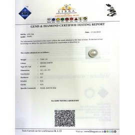 REPORT.NO.LPSC LPSC 140CLARITY.N/ACOLOUR.SHINING WHITESHAPE/CUT.ROUND WT.6.22 CTSDIMENSION.9.9-9.4-9.4R.INDEX.N/AHARDNESS.3.0COMMENT.PEARL {SOUTH SEA}..