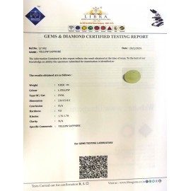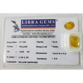 REPORT.NO.-LYA 153CLARITY.-N/ACOLOUR.-YELLOWSHAPE/CUT.-OVALWT.-4.60 CTSDIMENSION.-3-9.9-6.3-1.R.INDEX.-1.76-1.78HARDNESS.-9.0COMMENT.-YELLOW SAPPHIRE { A }..